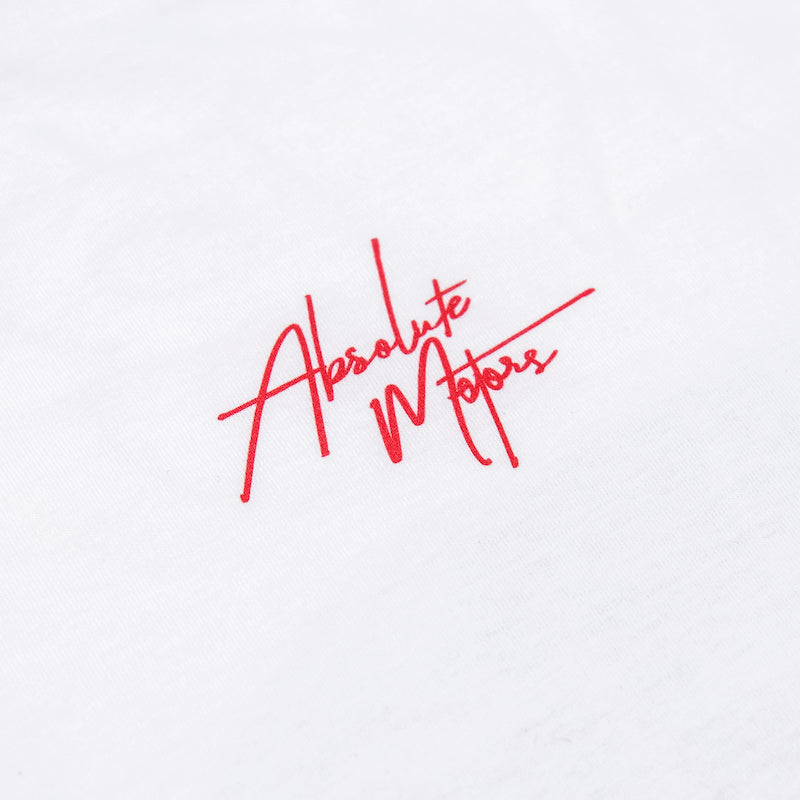White t-shirt with Absolute Motors signature on the front and a full color print of the “Absolute Motors RS6 Signature Car” on the back