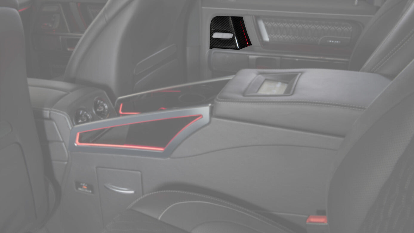 Transform your G-Class interior with the BRABUS Carbon Package Interior I. This 8-piece set is crafted with premium glossy carbon fiber, elevating the cabin's luxury feel to a new level.
