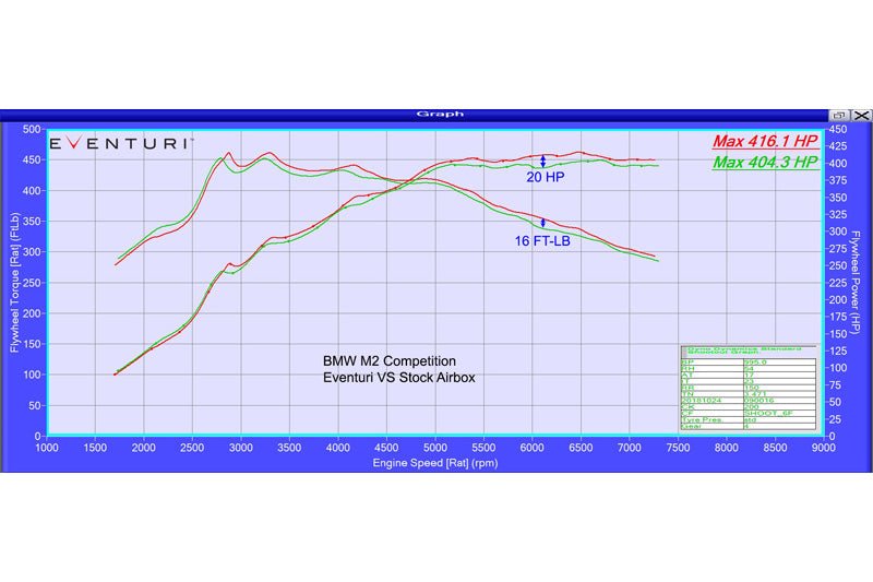 Above is a dyno graph showing the comparison between the Eventuri and the stock airbox on a M2 Competition. The car had no other modifications. As you can see, power and torque are increased through a large portion of the rpm range. This translates on the road to increased part throttle and full throttle response with the car pulling much more eagerly to the redline. The testing was done on the same day back-to-back and temperatures were monitored to ensure consistency. The hood was closed for all runs.